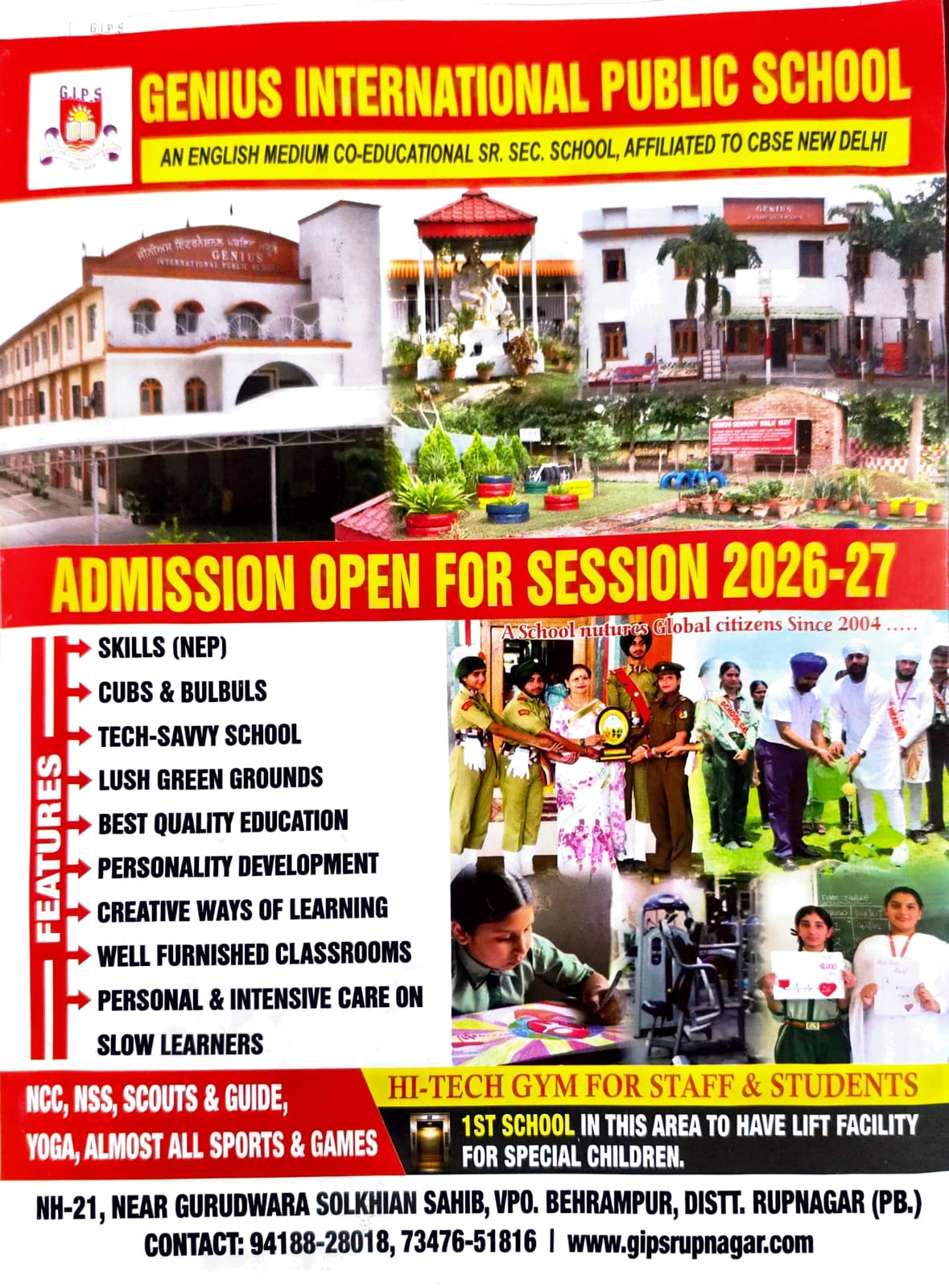 TGenius International Public School, is run by Ram Hari Educational and Research Trust, Nangal Chowk, Ropar, Punjab, established in 2004 affiliated to CBSE, New Delhi in the year of 2008. In 2014 the school completed its 10 years remarkable journey in the field of education ,and stepped ahead getting the affiliation for Senior Secondary Level. Now in the campus of Genius, students are getting the education upto Sr. Sec. Classes. The school to all the students aspiring to be doctors, engineers, lawyers, bureaucrats, defence personnel, CA etc. by offering array of subject combinations.
